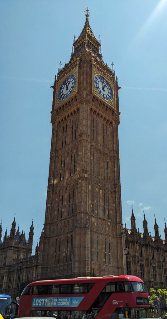 L’icône de Londres ! Depuis le pont de Westminster, admire l’Elizabeth Tower, célèbre pour sa cloche surnommée Big Ben, et le Parlement britannique qui occupe le Palais de Westminster.