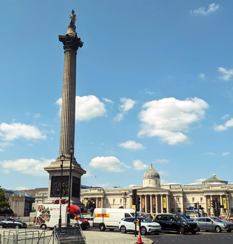 Direction Trafalgar Square, une place emblématique de Londres, célèbre pour la colonne Nelson, ses fontaines et ses statues.