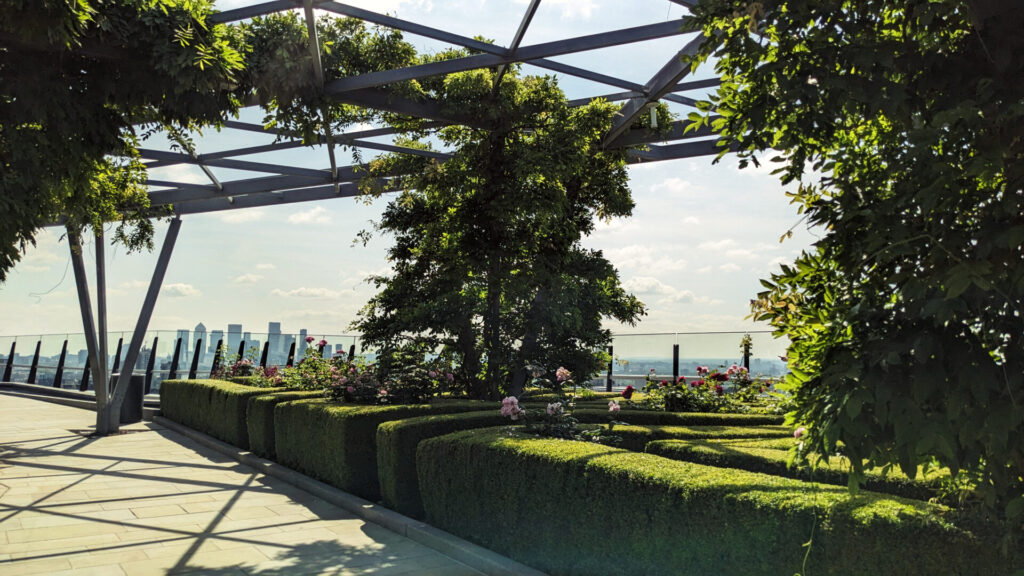 Ce rooftop verdoyant et paisible qui offre une vue dégagée sur la City est l’un de mes spots préférés à Londres ! Le panorama y est à couper le souffle et surtout : on n’y a croisé presque personne. C’est une belle alternative sans touriste !